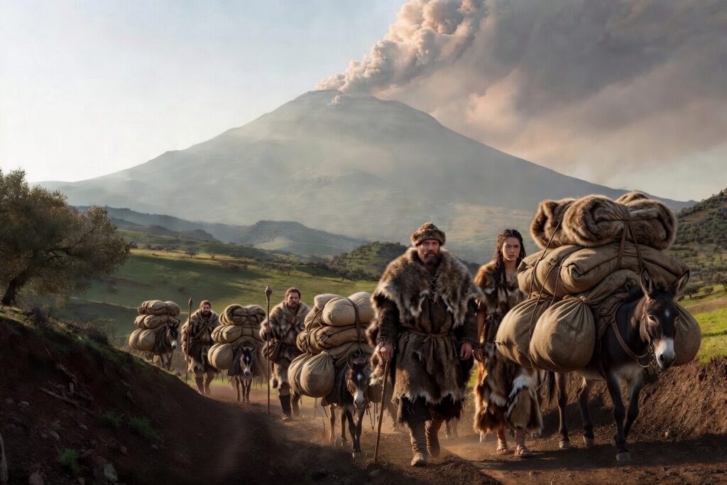 A clear morning brought some visitors. They were a band called the Toolmakers who had descended from the Volcanic Highlands of Blackpeak. They lead several sturdy donkeys laden with packs. The group brought finely crafted obsidian blades, flint tools, and strong carved staffs of mountain hardwood, planning to make trades. Among them were Garrick and Lira, whom Selah knew from the previous year. Selah stepped forward with fresh bread and cool water from the spring.