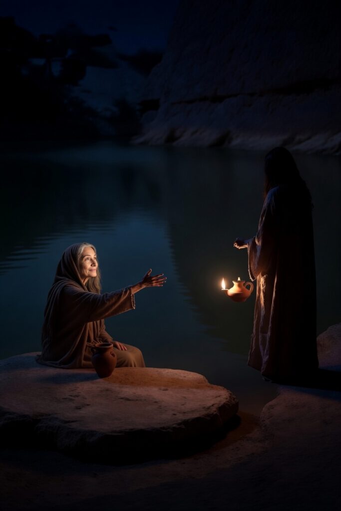 The raw honesty took Lira by surprise, yet after a few heartbeats, she continued her approach. Lira’s lamplight fell across the water, and her footsteps gave away her presence. Selah quickly wiped her eyes and turned to see Lira approaching.
